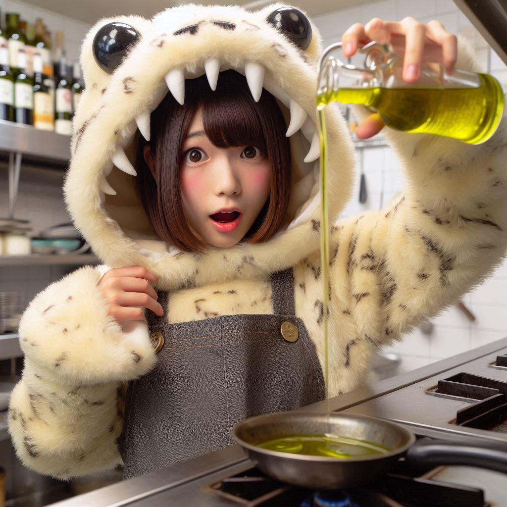 ???>ノコちゃん駄目だよそんなかけ方じゃ。オリーブオイルはもっと高い位置からかけないと。