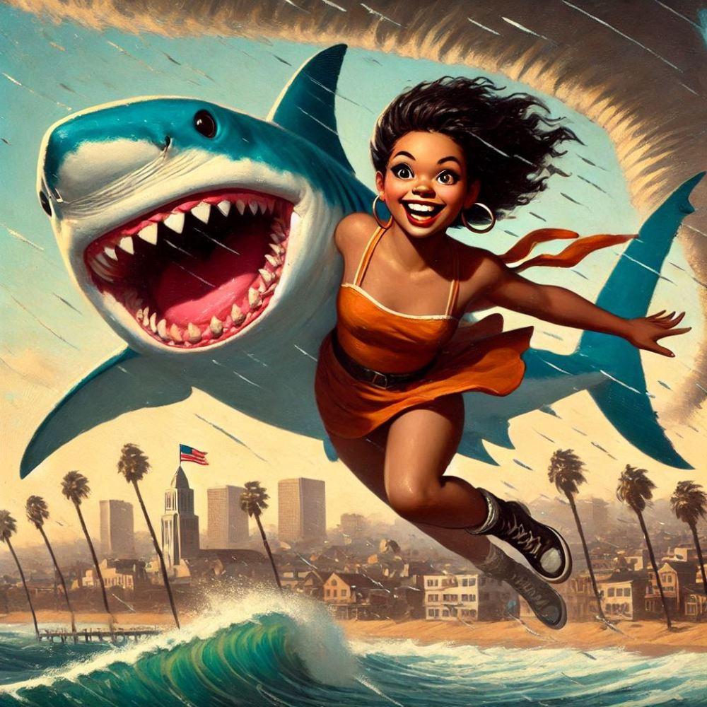 美少女&油絵ファンタジー、竜巻で飛ぶモンスター娘サメ娘、ロサンゼルス海岸