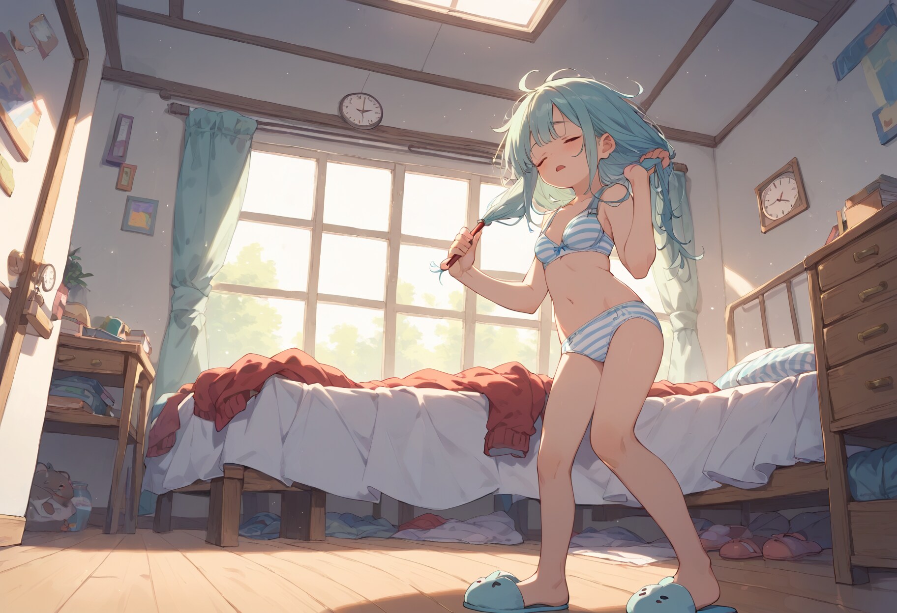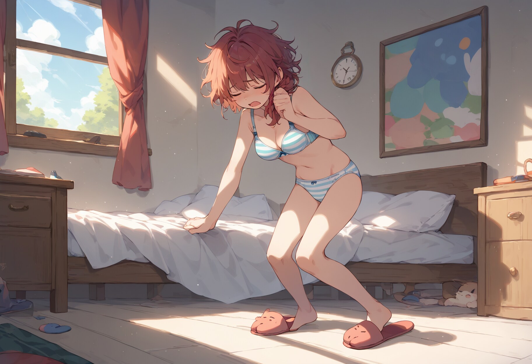Steps: 30, Sampler: DPM++ 2M, Schedule type: Karras, CFG scale: 7, Seed: 1977154260, Size: 1216x832, Model hash: 44d3daf083, Model: 7thAnimeXLPonyA_v10, VAE hash: 81fb11e0b2, VAE: sdxl_vae.safetensors, Denoising strength: 0.7, Clip skip: 2, Hires prompt: "(score_9,score_8_up,score_7_up,score_6_up,score_5_up,score_4_up),source_anime,\nzPDXL2,best quality,masterpiece,absurdres,soft lighting,rating_safe,\nBREAK\n1girl,sleepy expression,messy hair,yawning,rubbing eyes,(red and white striped panties,red and white striped bra:1.5),bedroom morning light,standing in front of mirror,slow movements,half-open eyes,bedhead,sleepy morning routine,slightly slouched posture,\nBREAK\ncozy room,sunlight streaming through window,unmade bed,blanket partially falling off,slippers on floor,school uniform neatly laid out on a chair,mirror reflection,sleepy and sluggish,brushing hair,getting ready for school,struggling to wake up,\nBREAK\nsoft pastel tones,warm morning glow,early morning routine,peaceful and quiet atmosphere,gentle morning light,clock ticking,morning haze,feeling groggy,preparing for the day,\nfrom front ,", Hires upscale: 1.5, Hires upscaler: R-ESRGAN 4x+ Anime6B, TI hashes: "zPDXL2: 649c47827d59, zPDXL2: 649c47827d59, zPDXL2: 649c47827d59, zPDXL2: 649c47827d59, zPDXL2: 649c47827d59, zPDXL2: 649c47827d59, zPDXL2: 649c47827d59, zPDXL2: 649c47827d59, zPDXL2: 649c47827d59, zPDXL2: 649c47827d59, zPDXL2: 649c47827d59, zPDXL2: 649c47827d59, zPDXL2: 649c47827d59, zPDXL2: 649c47827d59, zPDXL2: 649c47827d59, zPDXL2: 649c47827d59, zPDXL2: 649c47827d59, zPDXL2: 649c47827d59", Version: v1.10.1-amd-2-g395ce8dc