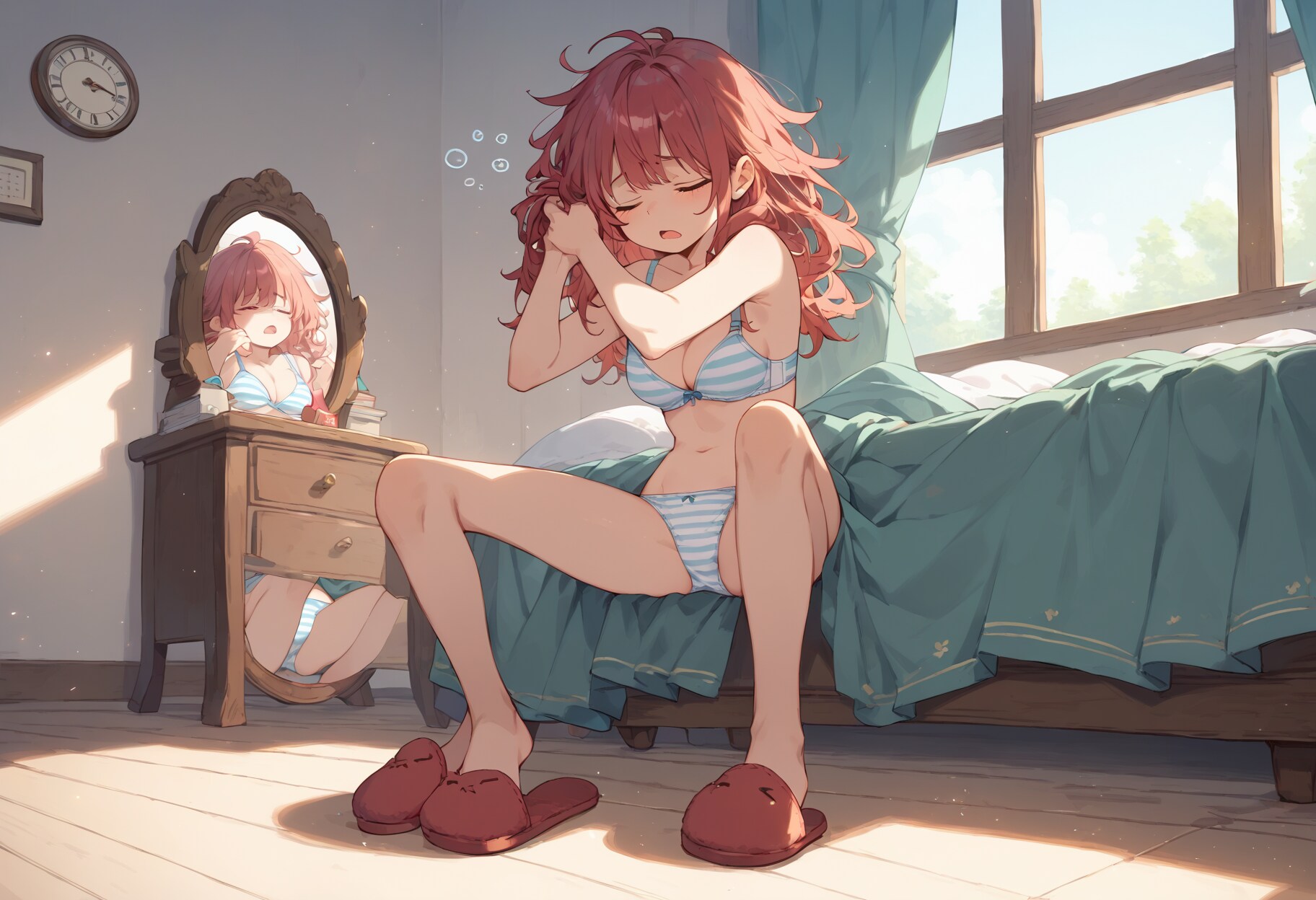 1girl,sleepy expression,messy hair,yawning,rubbing eyes,(red and white striped panties,red and white striped bra:1.5),bedroom morning light,standing in front of mirror,slow movements,half-open eyes,bedhead,sleepy morning routine,slightly slouched posture,