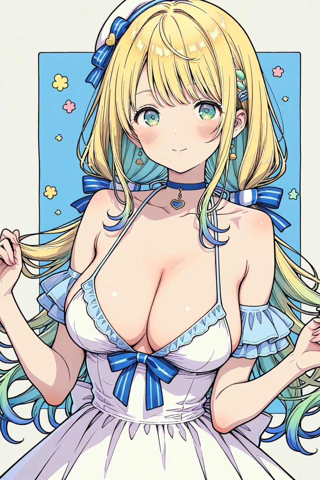 blonde beautiful lady, ribbon cap, cleavage temptation outfit, long tied hair, emerald eyes, large breasts, art paper background,