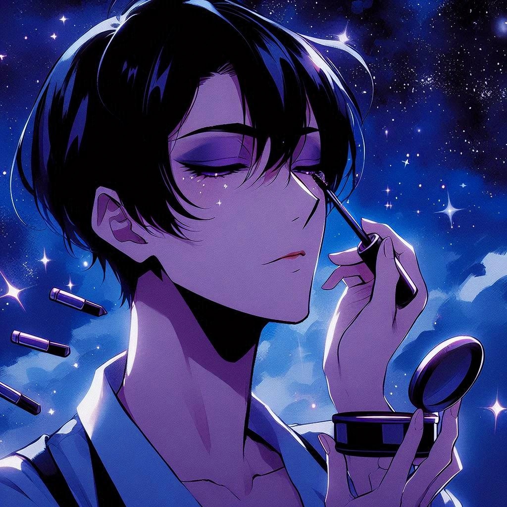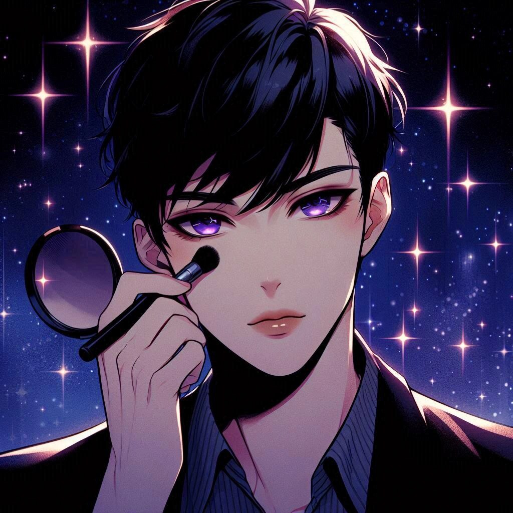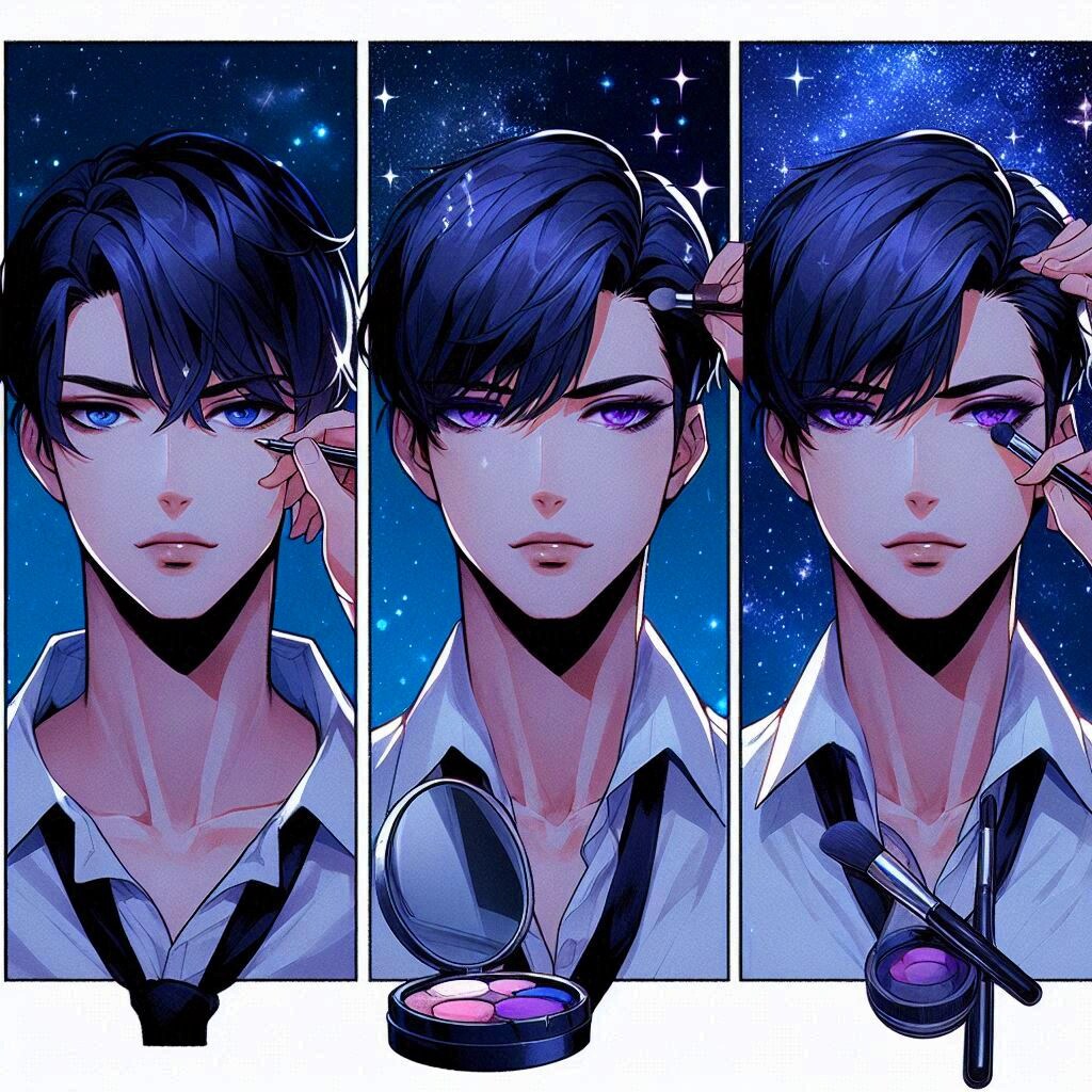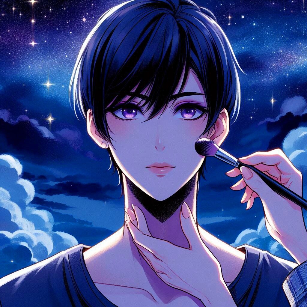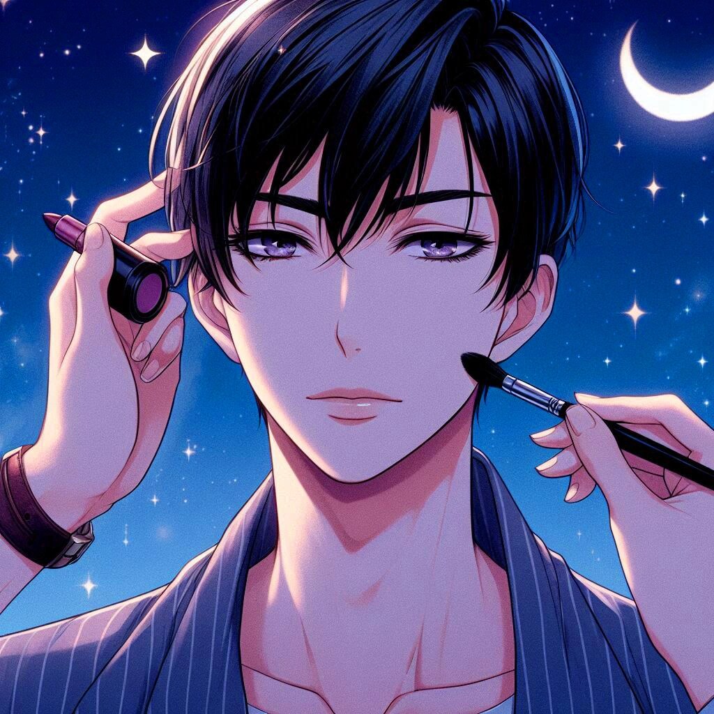 では、メイクをキメた、黒髪短髪男性をご覧下さいー。