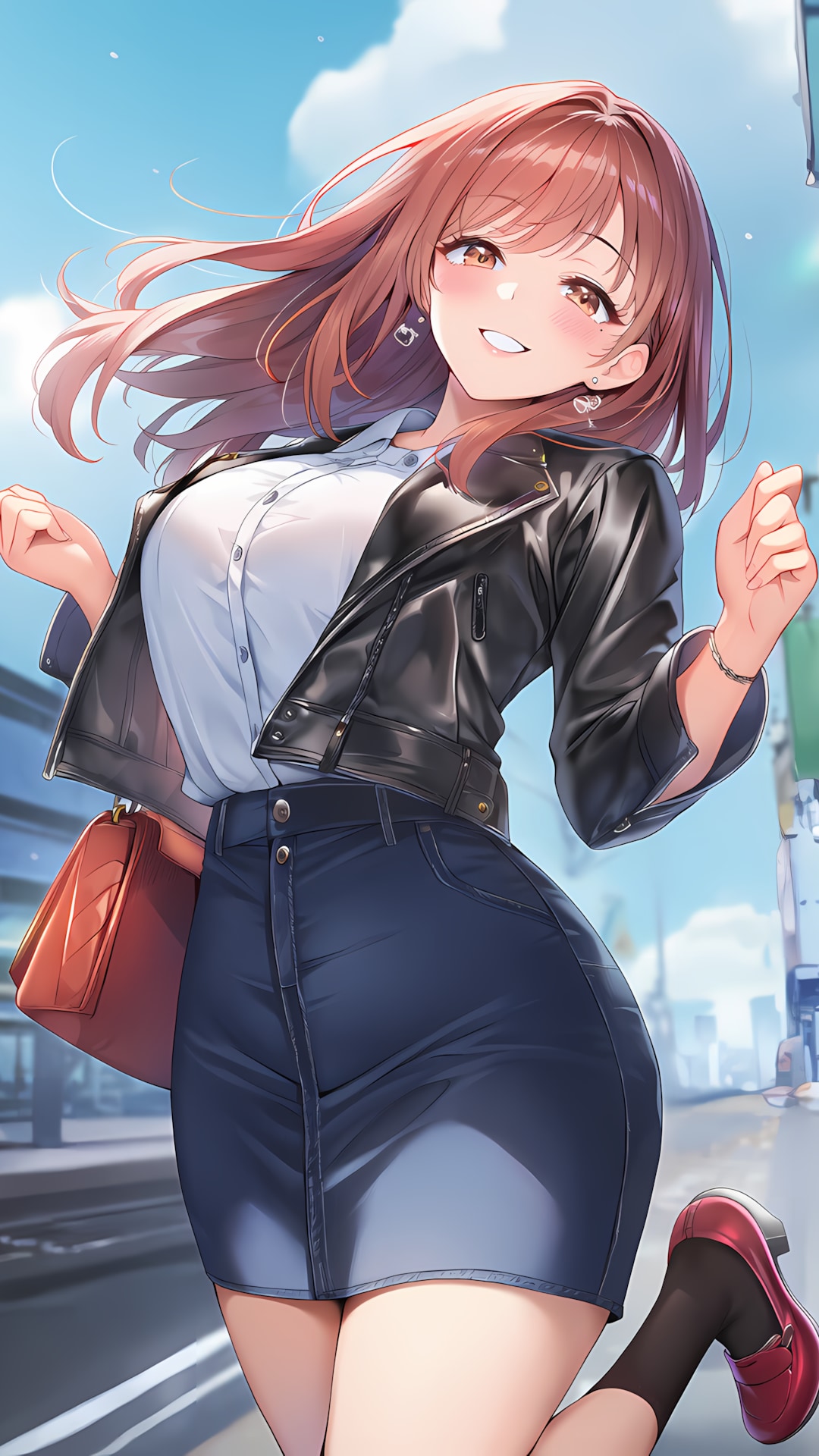 ☁️ノノカのレザーポロ通勤👠 ミディスカートで曇り朝を優雅に!