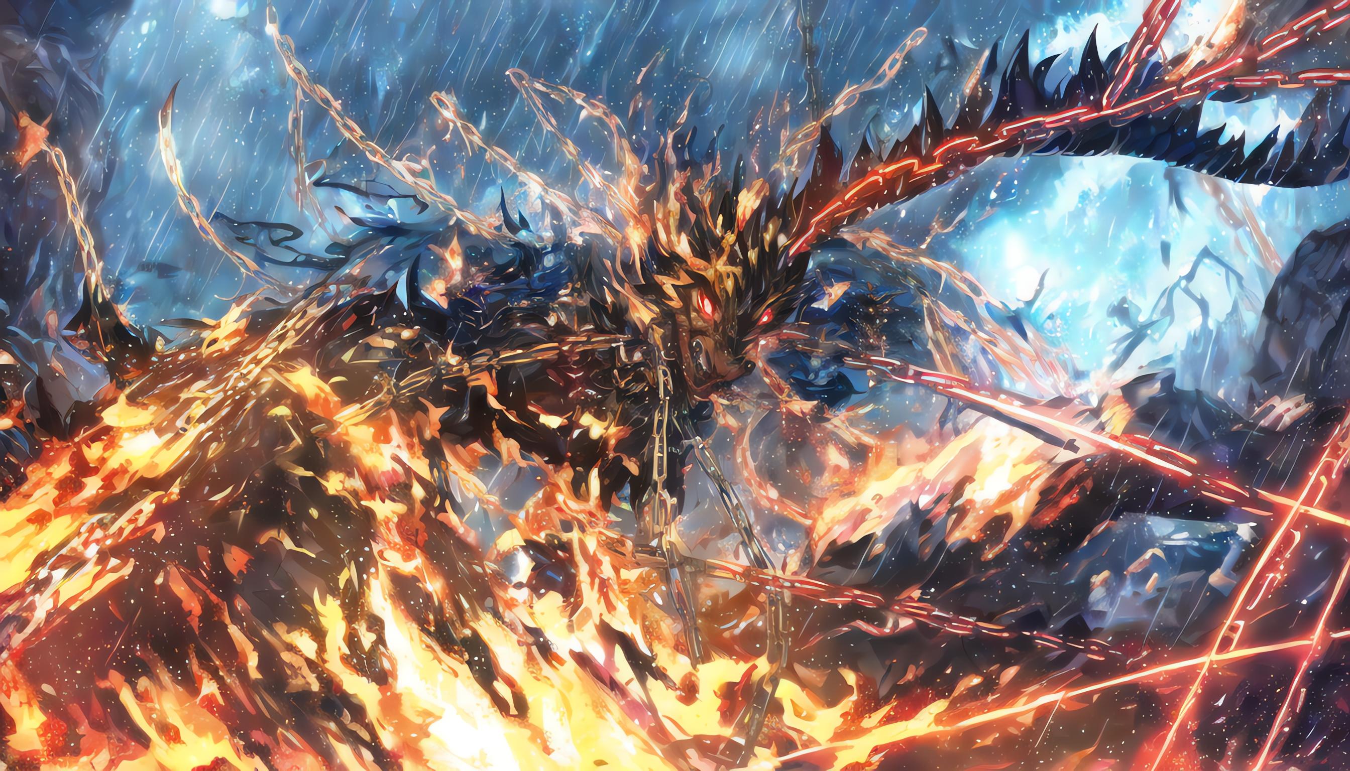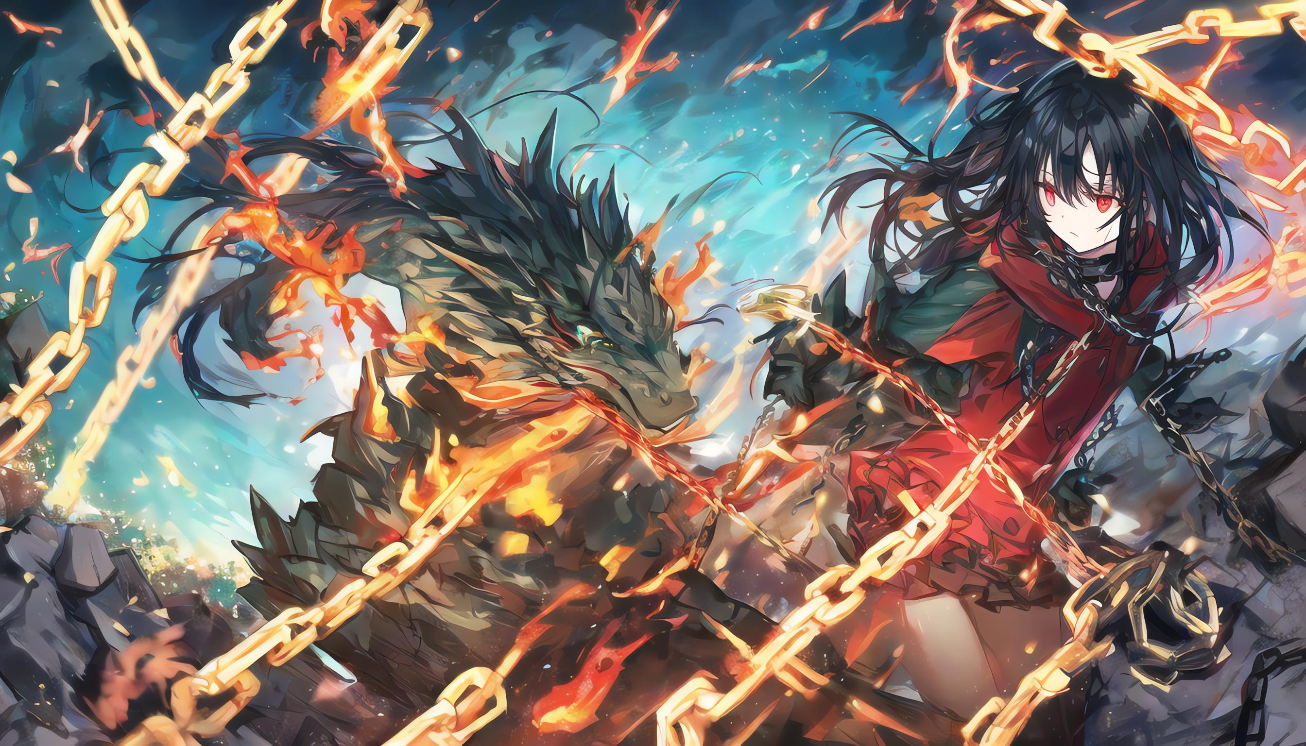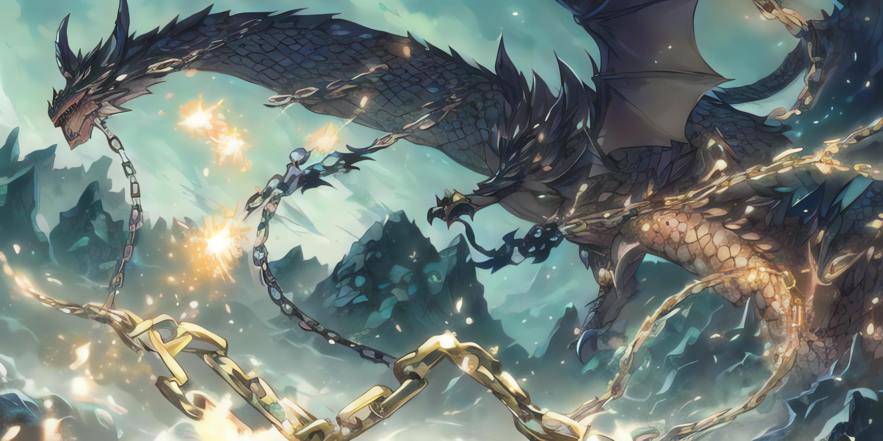 彼女はその隙をつき、再び竜に向かって飛び込み、竜の全身を鎖で締め上げた。