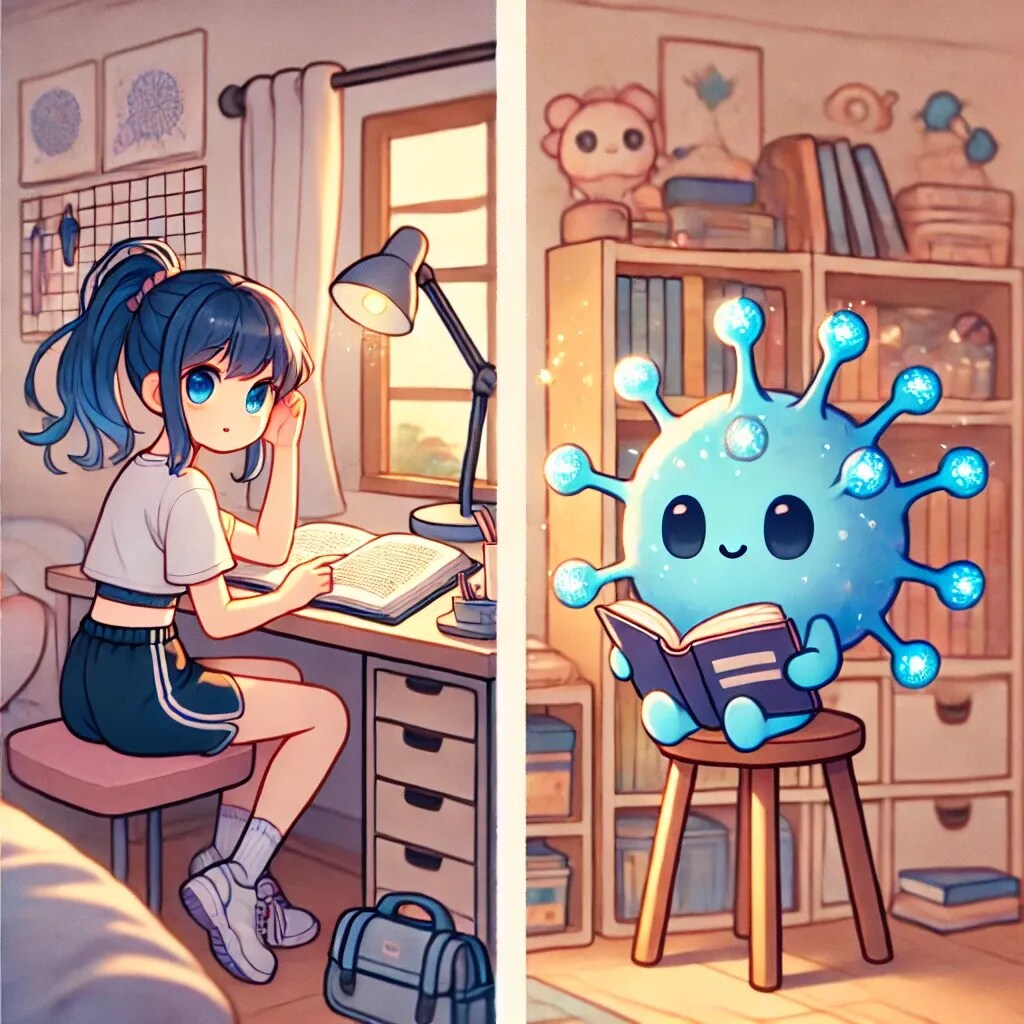 少女の困った表情と、冷静に本を読む神経細胞マスコットの対比が面白いですね!😊🎨