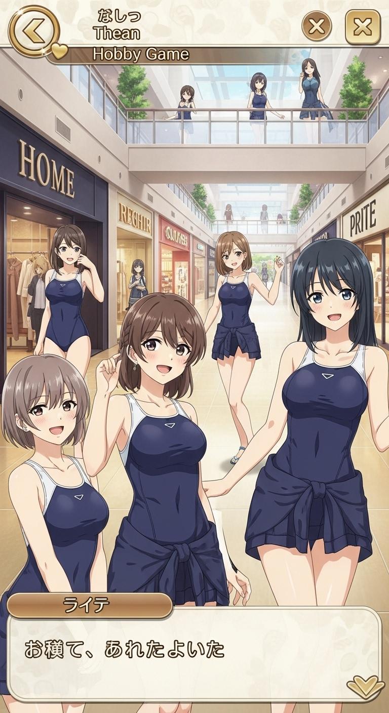 内容は、スク水を着た女の子達とスク水専用ショッピングモールでデートを重ね、好感度を上げていく謎恋愛ゲームのゲーム画面って内容です😊♪。