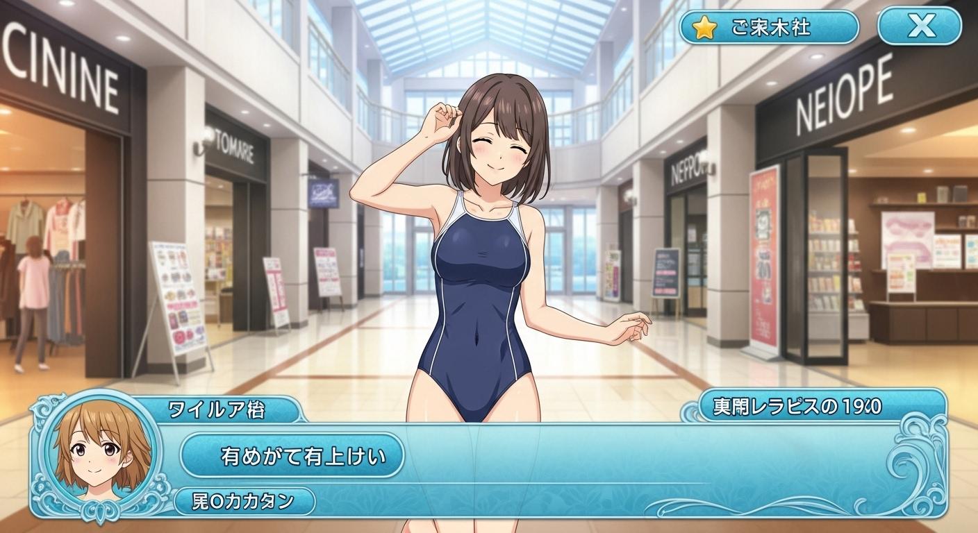(ゲーム画面風)スク水彼女とスク水モールでデートする恋愛ゲーム♪