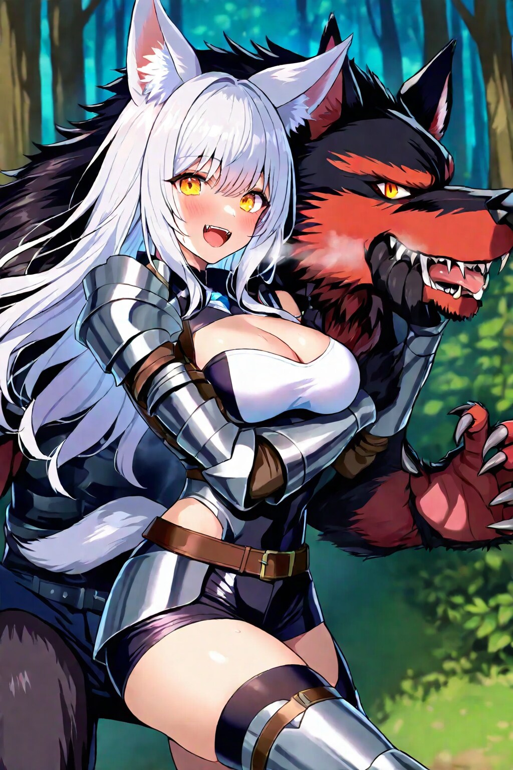 [空欄答え]森の騎士団(白髪の美少女)、種族は(狼娘)で特技は(噛みつき )