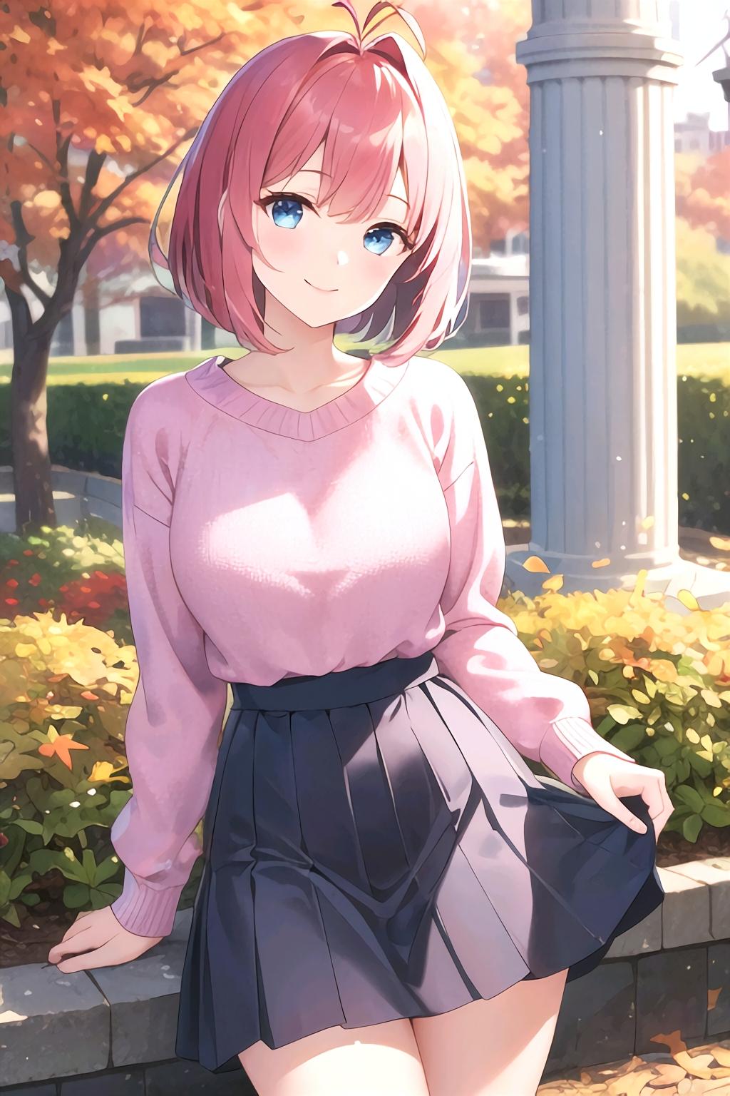 short, medium bob, slightly larger chest, red hair,antenna hair, fluttering hair, light-blue eyes, droopy eyes,