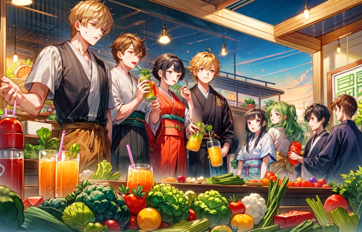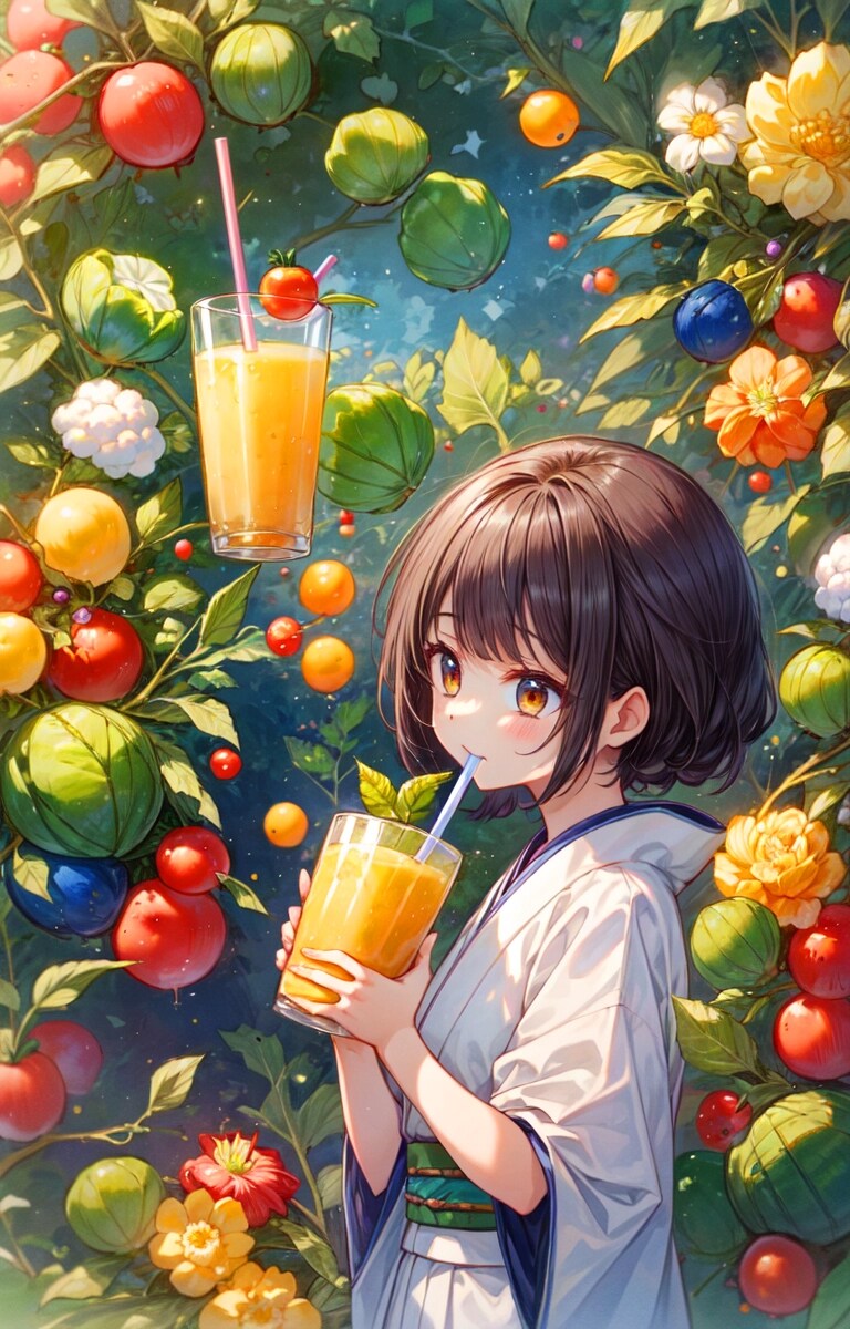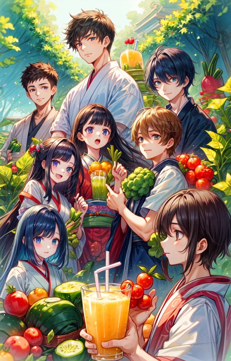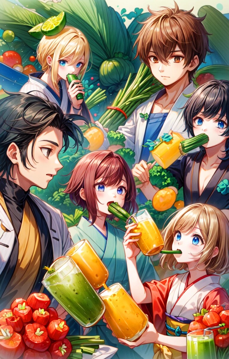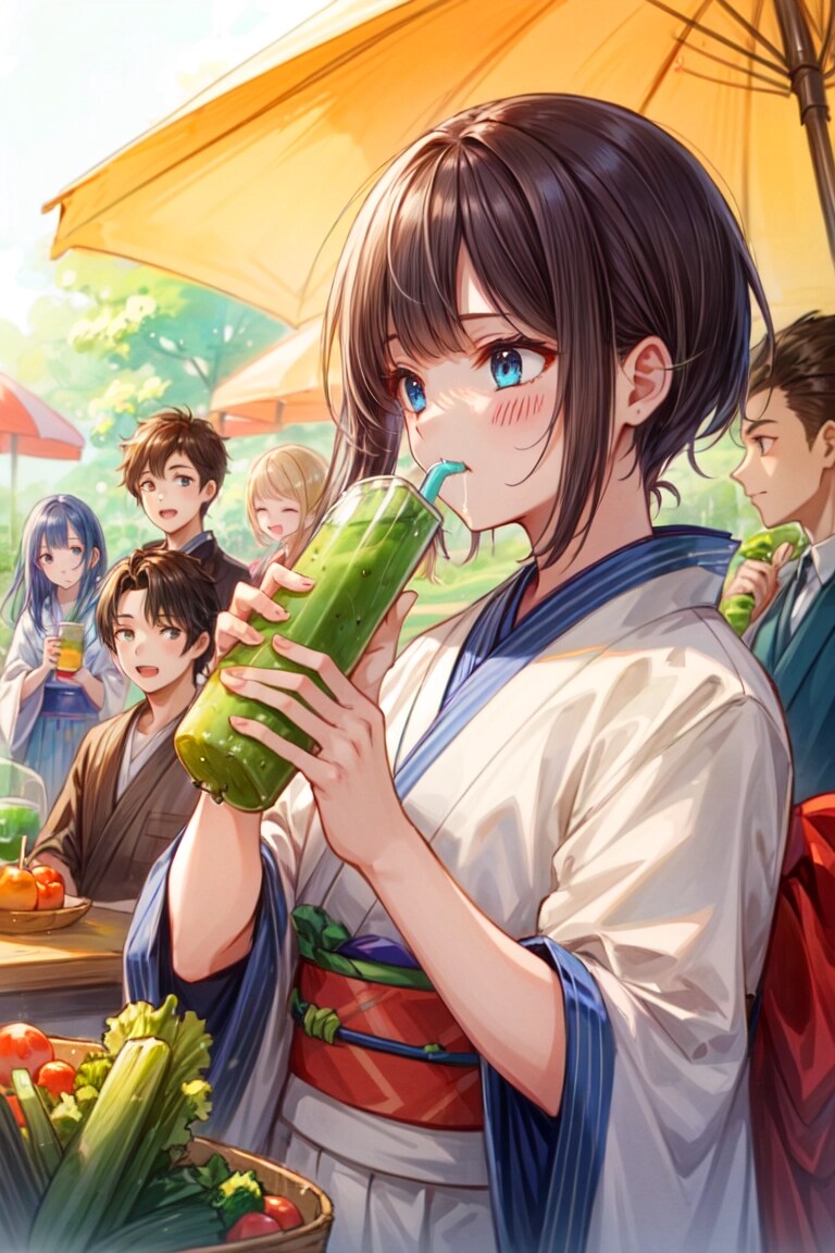 結果、みんなで楽しそうに野菜を収穫して、青汁を飲む光景が生成できて良かったですー。そしてやっぱりどこかカオスな作品になりました!!飲む描写はやっぱり難しいですね。でもこれまでよりはちゃんと飲んでいるのではないかと思います!!野菜もおいしそうに見えて良いですー。
