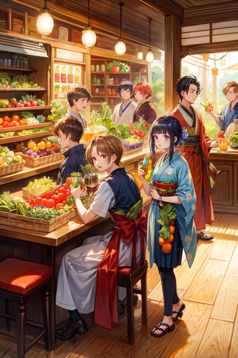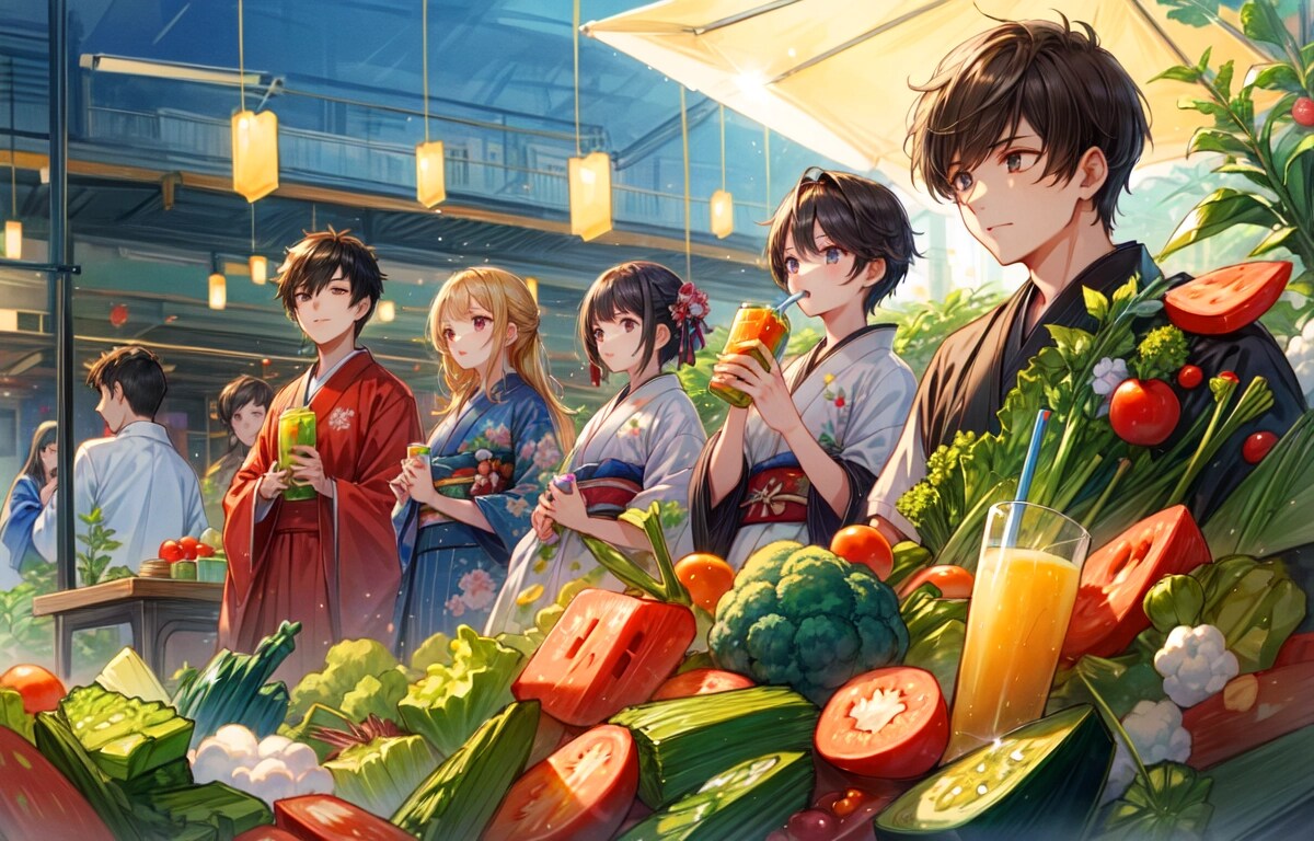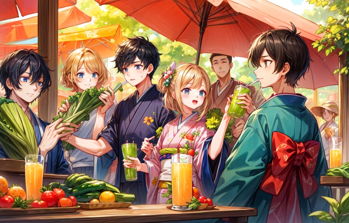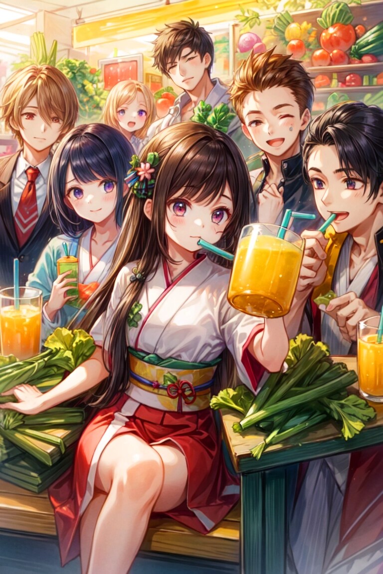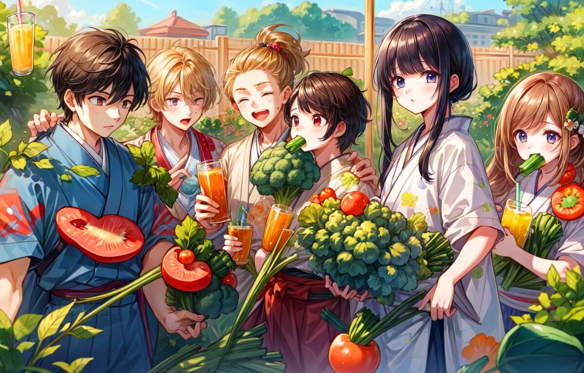 結果、みんなで楽しそうに野菜を収穫して、青汁を飲む光景が生成できて良かったですー。そしてやっぱりどこかカオスな作品になりました!!飲む描写はやっぱり難しいですね。でもこれまでよりはちゃんと飲んでいるのではないかと思います!!野菜もおいしそうに見えて良いですー。