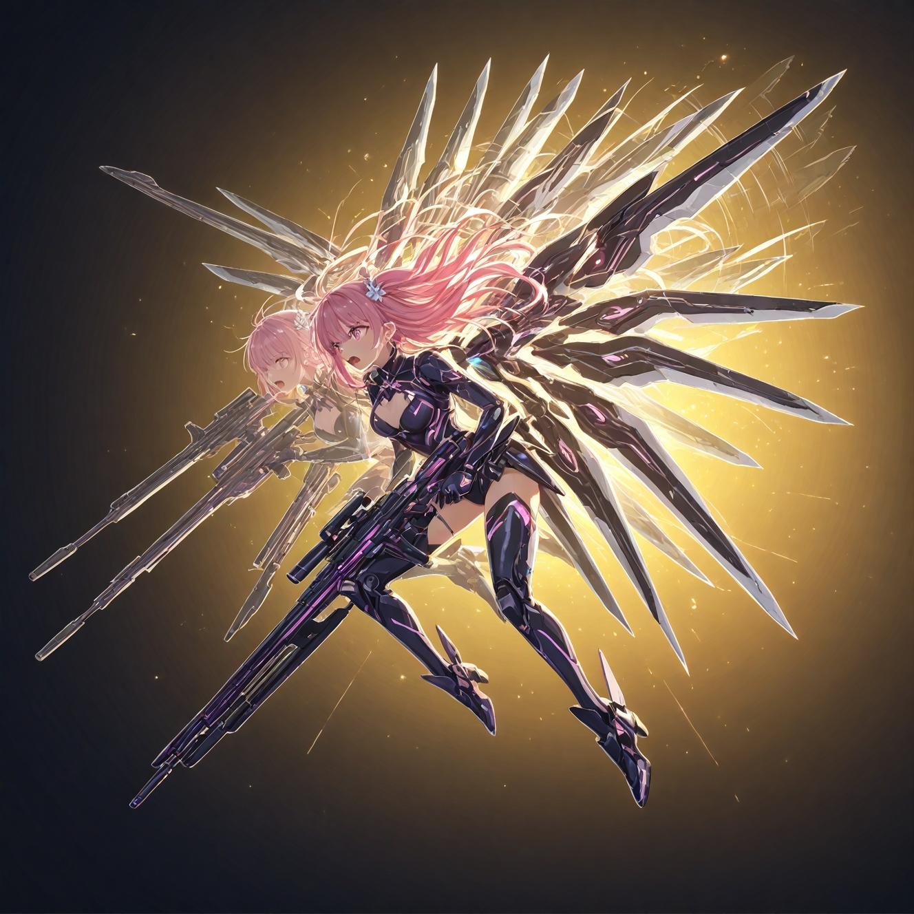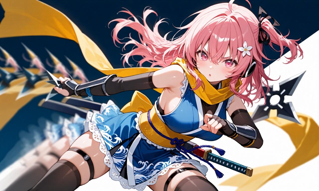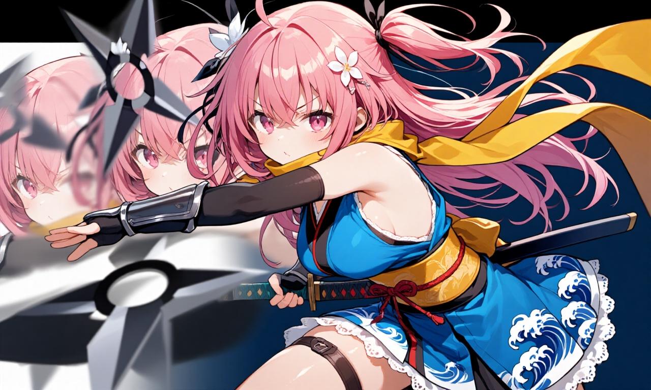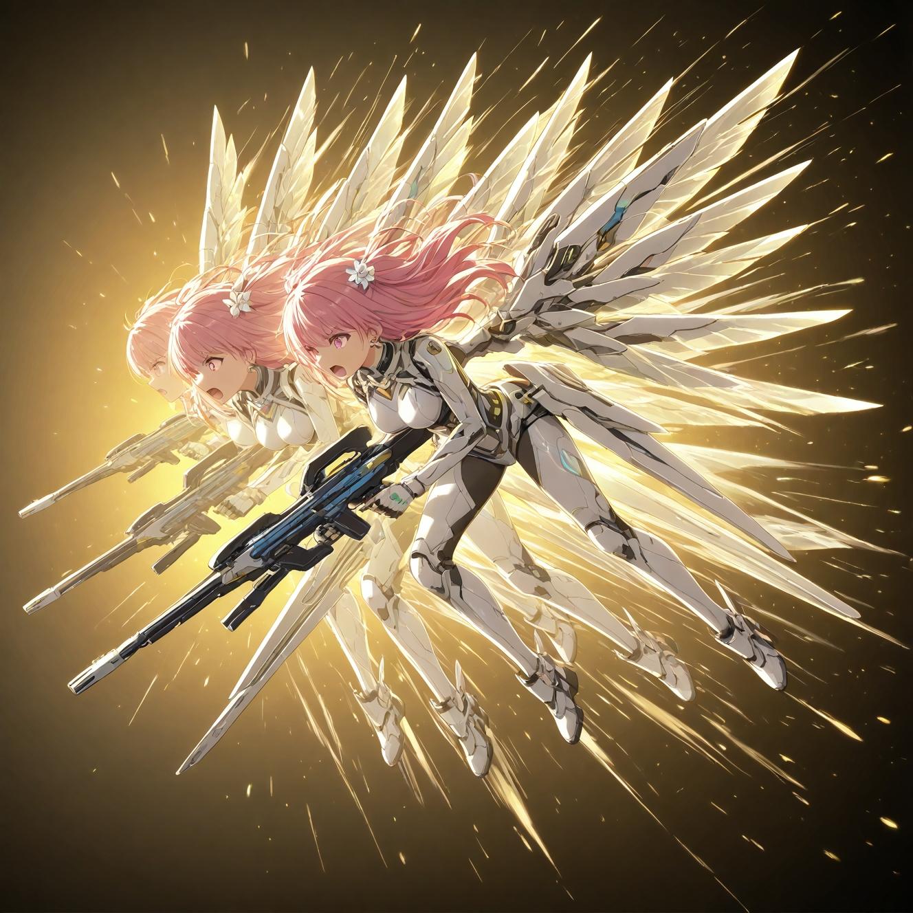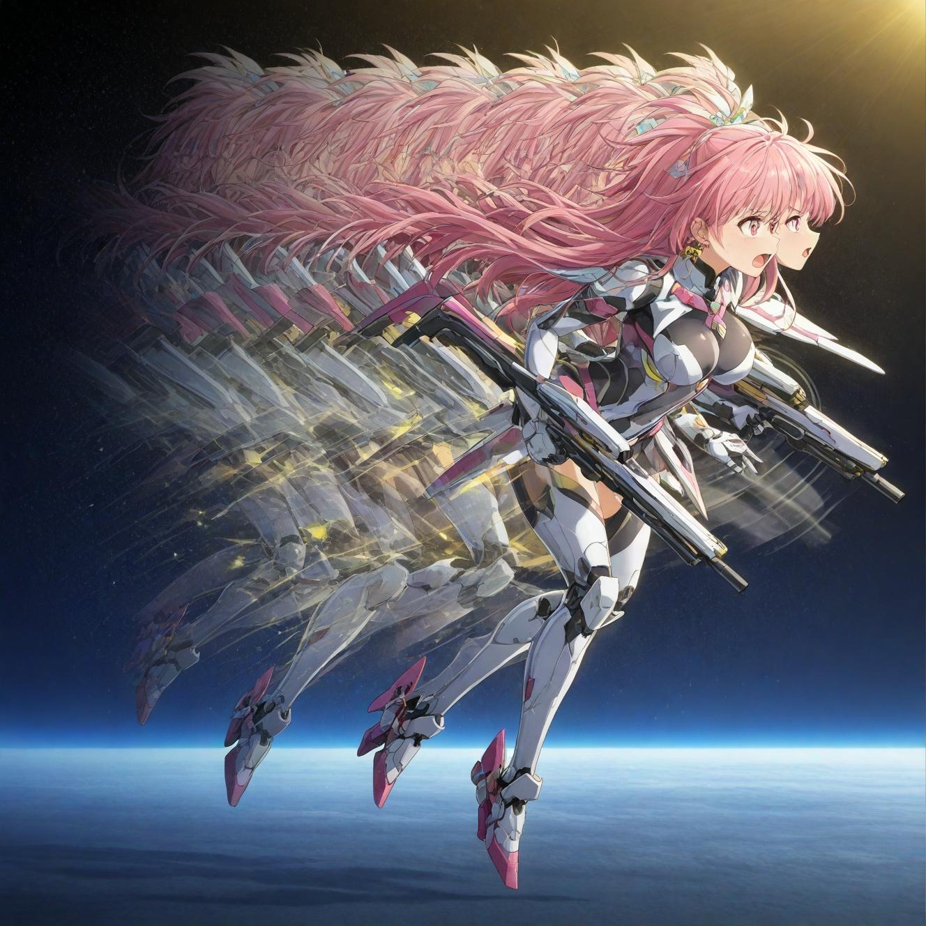 そこらへんにafterimagesとか、motion blurとかいろいろ足して、プロンプト並び順や強調を調整したり縦横比変えたりしました。強調しすぎると崩壊したり、ガタキリバコンボの分身(わかりづらい)のようにたくさん出ます。