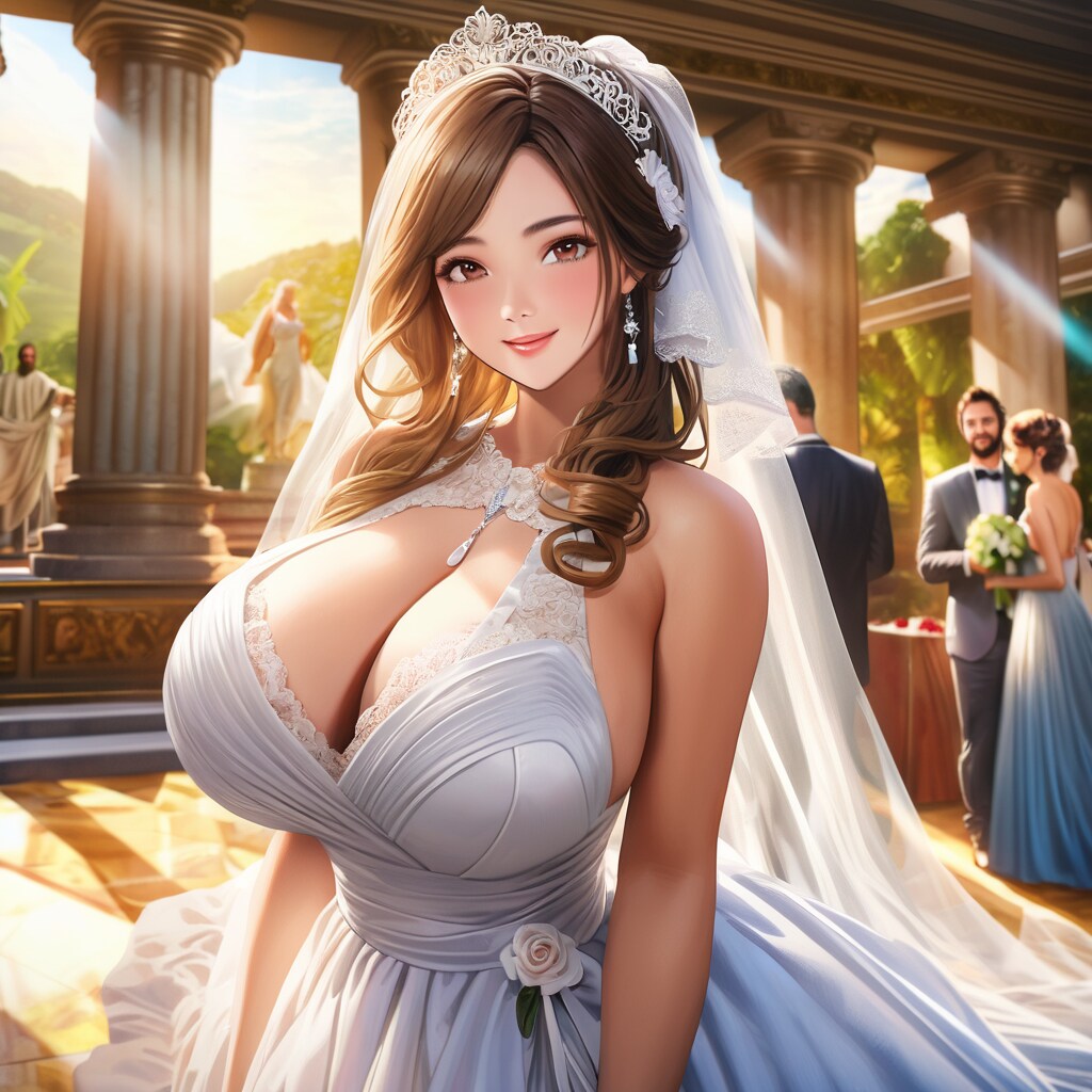 今度はローマ神話に出てきそうな古代神殿で挙式を揚げた新婦さんを中心にAI生成出来ました
