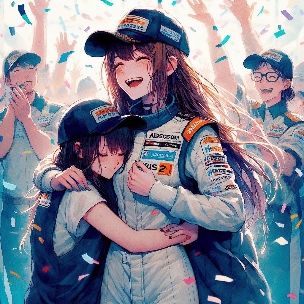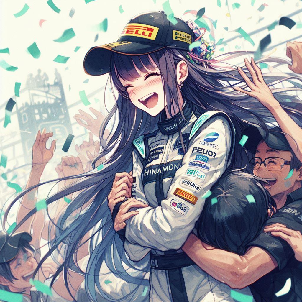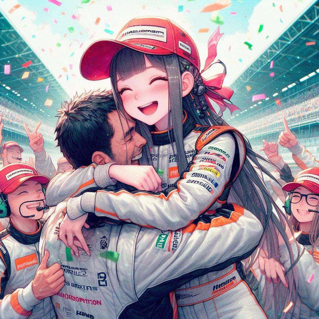 最初は前と同じ表彰台でトロフィー掲げてるところで作っててそれも良いかなと思ったんですが、途中からチームスタッフと抱き合っている構図に変更しました。