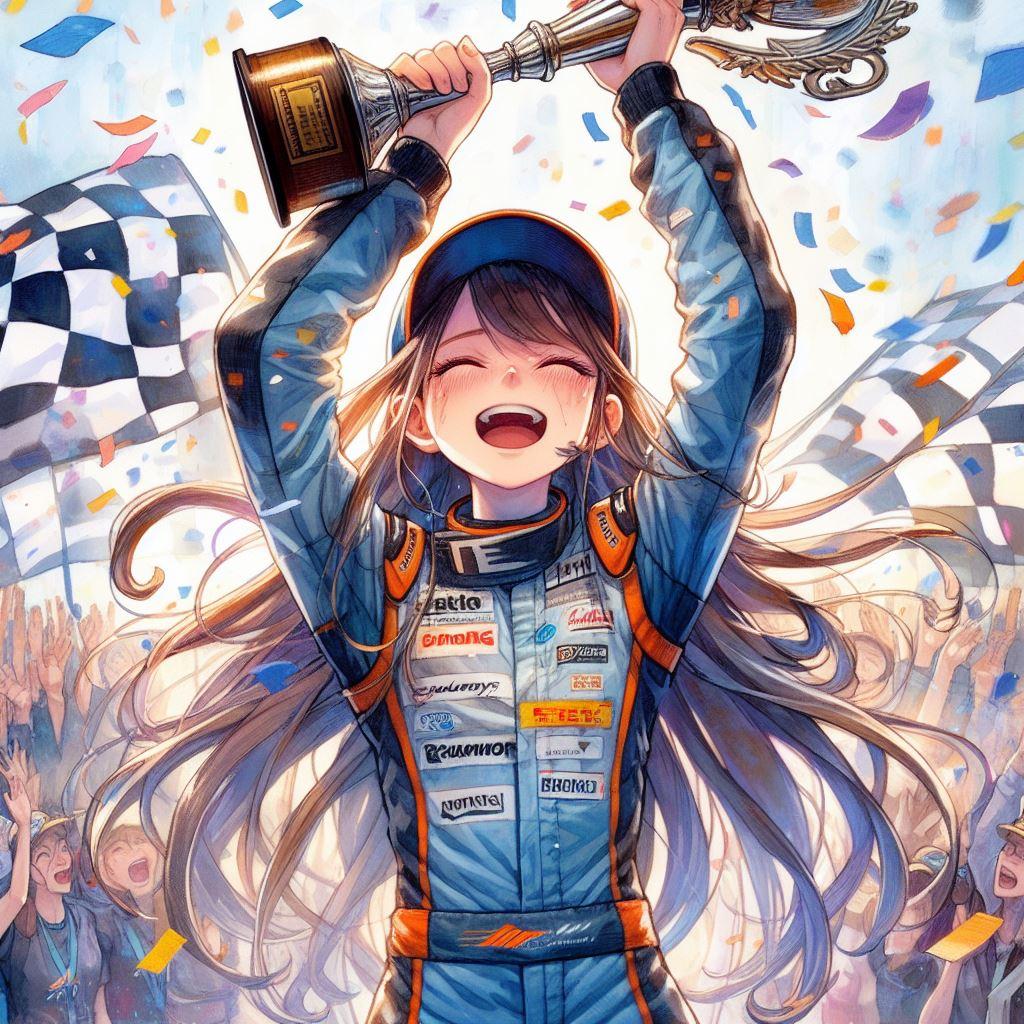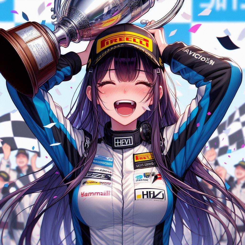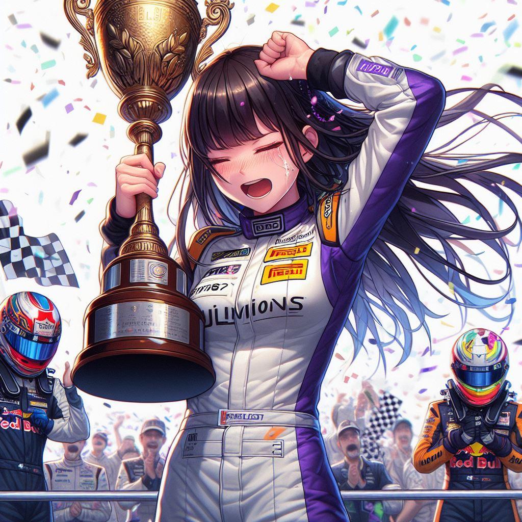 最初は前と同じ表彰台でトロフィー掲げてるところで作っててそれも良いかなと思ったんですが、途中からチームスタッフと抱き合っている構図に変更しました。