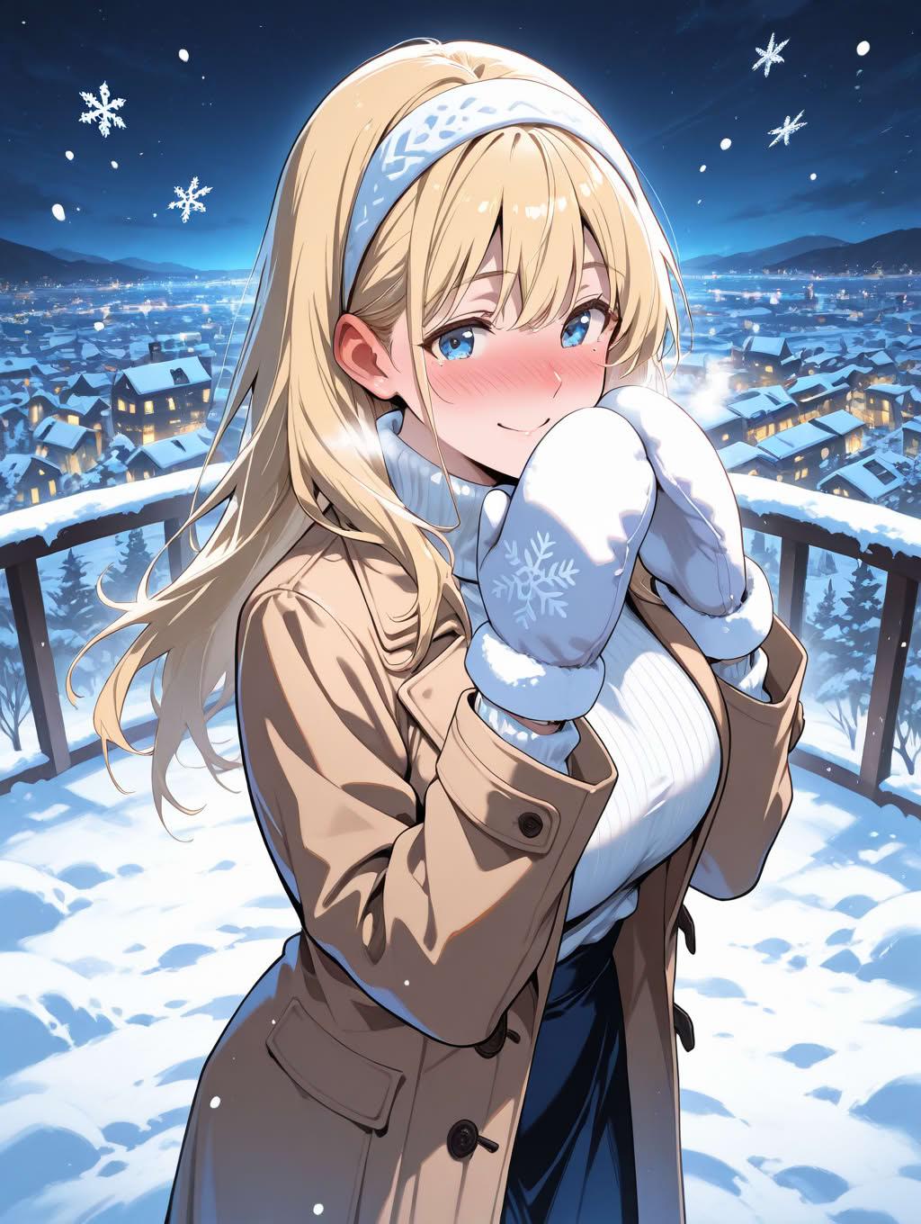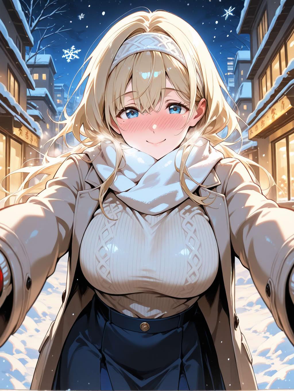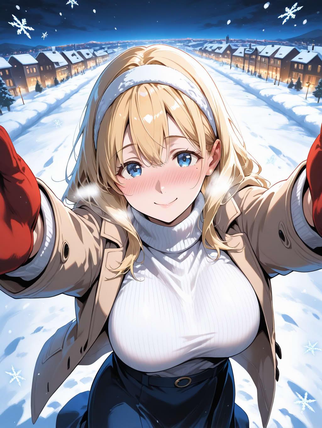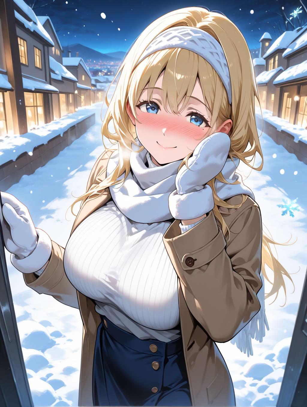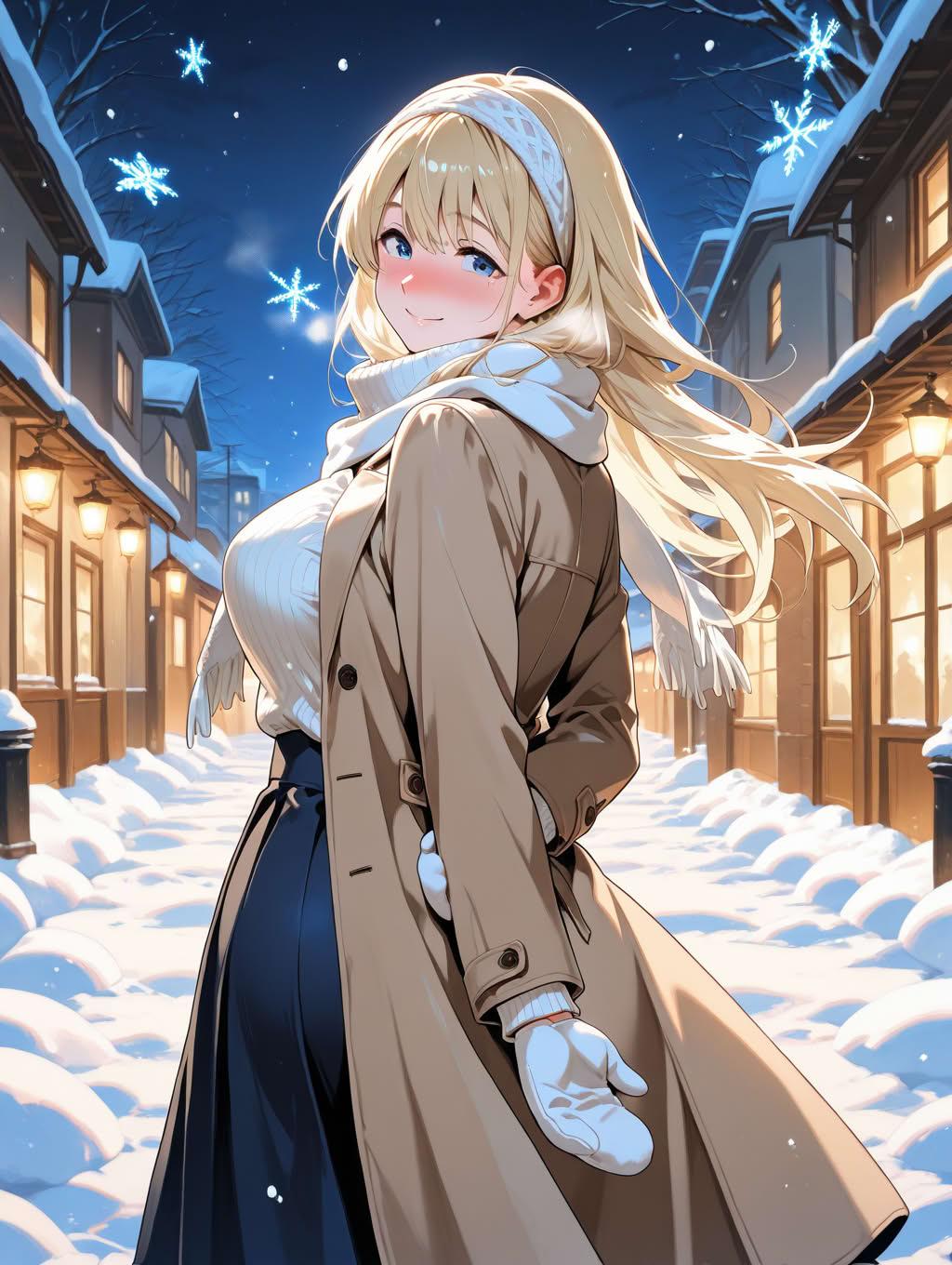 ブロンドお姉さんと雪降る夜の街の散歩