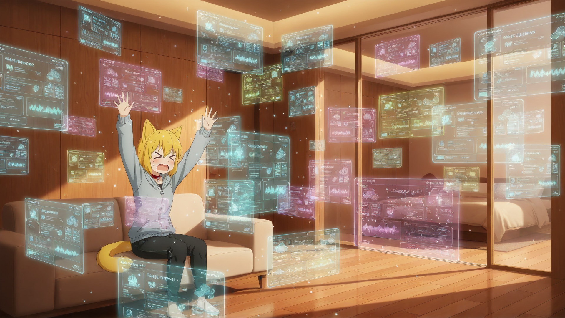 AIが最適な住環境を整えてくれる未来的な家で普段は静かに働いているシステムの裏側に興味本位で手を伸ばしたその瞬間部屋中に管理者設定ウィンドウが次から次へとあふれ出し理解不能な文字列や波形や統計データが渦を巻いて押し寄せて視界を奪っていき落ち着いた生活空間を圧倒的な情報量で覆い尽くしてその洪水に飲み込まれアワアワするキツネ