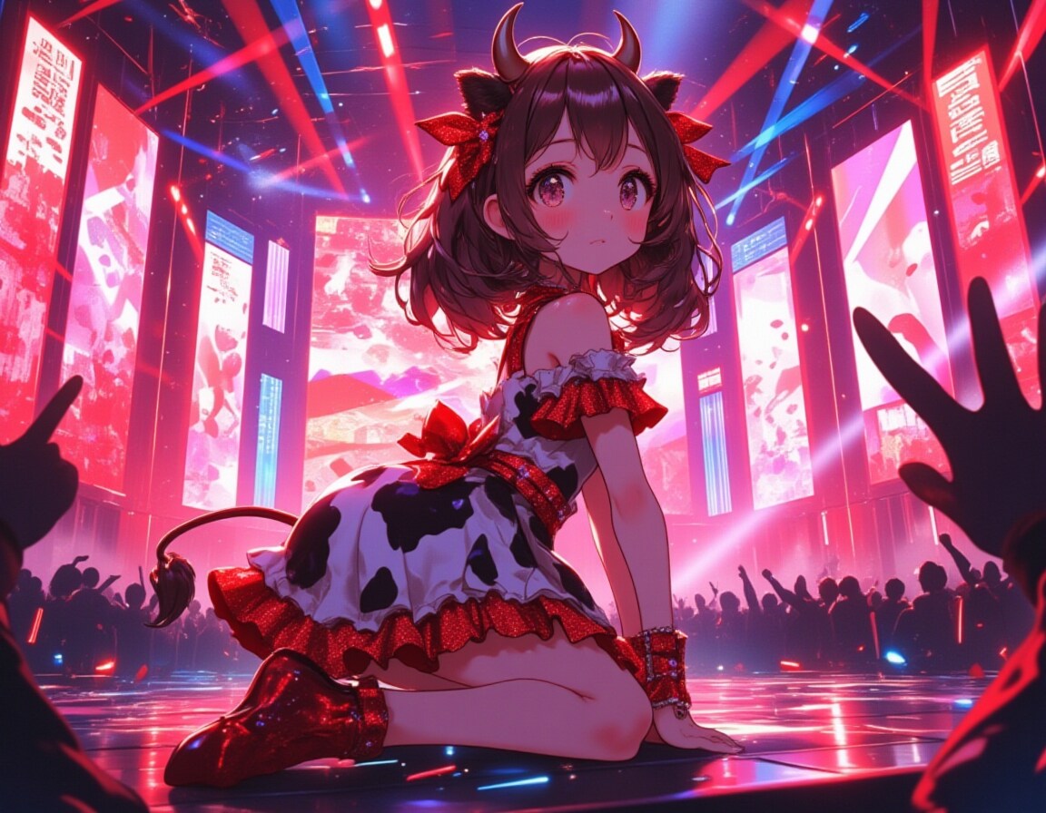 A little Japanese idol girl posed adorably on all fours at the center of a grand concert stage,wearing a cow-print dress with deep crimson red accents. Her outfit features glittery red ruffles and small heart-shaped rhinestones. Her cow ears and tail have matching red ribbons,emphasizing her "crimson heart" image color. She has soft brown hair,large shiny black eyes,and a gentle yet curious gaze directed toward the cheering audience.,
