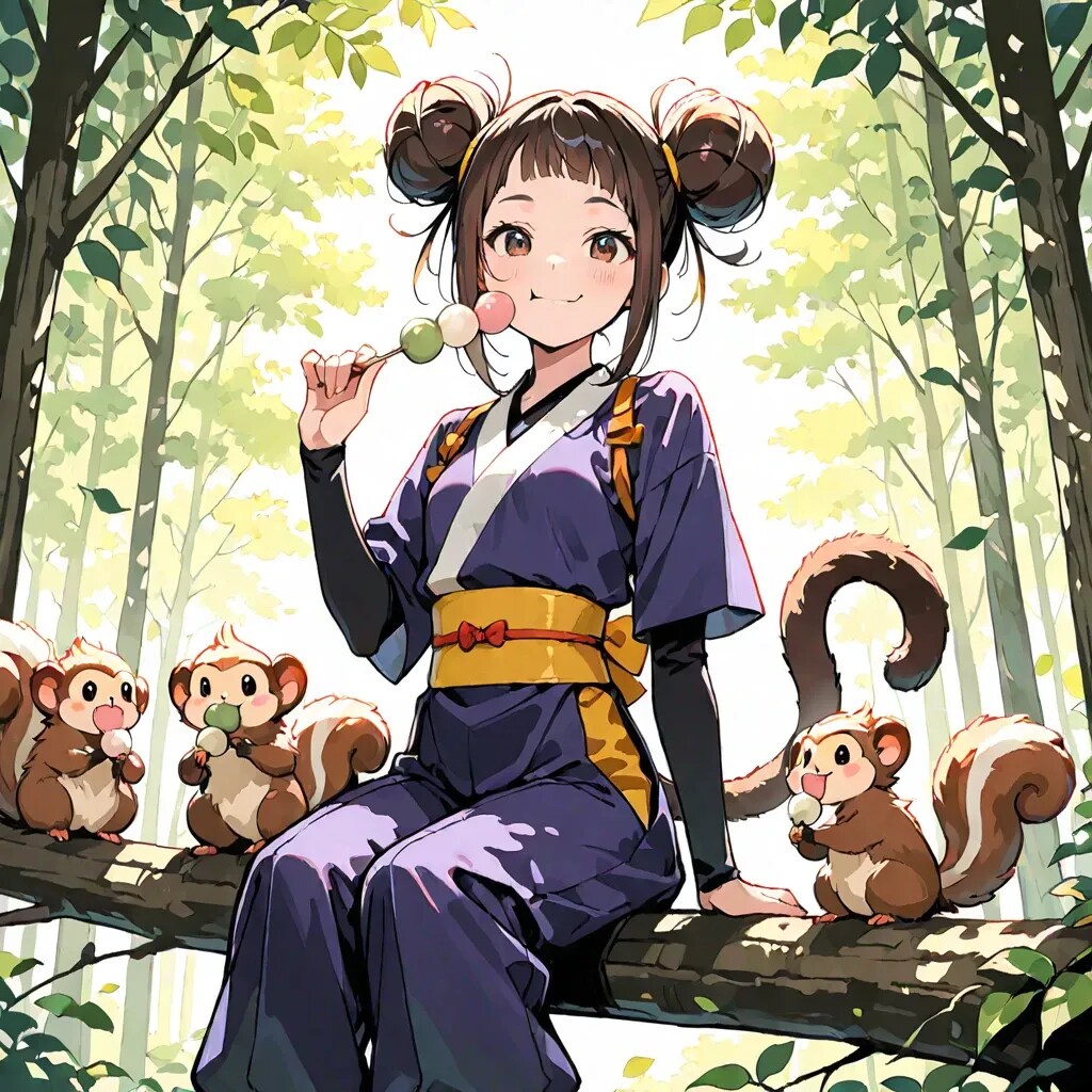 可愛い成分のためにオフの普段着+お団子モグモグも追加してみました。(猿とリスの中間のような生物が…)