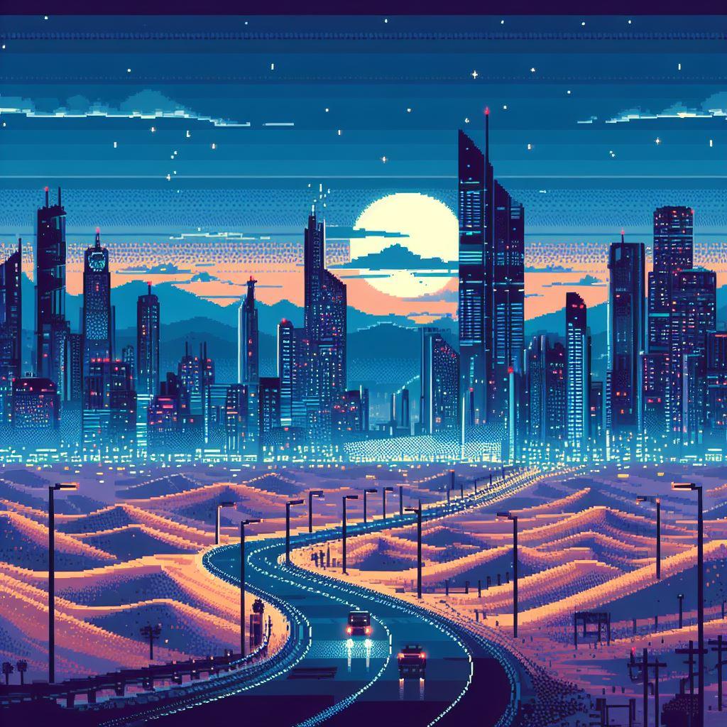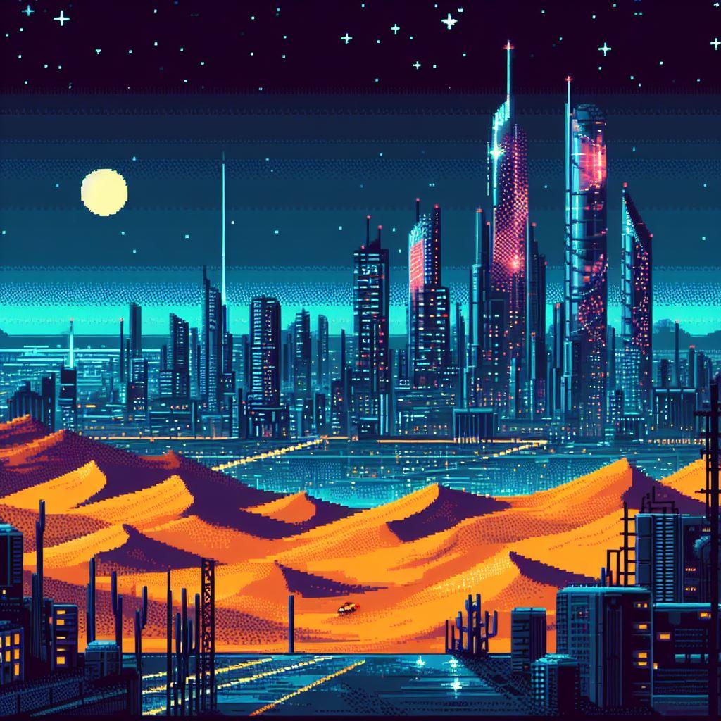 高度に発展した都市と砂漠地帯を対比させた風景をイメージして生成しました。