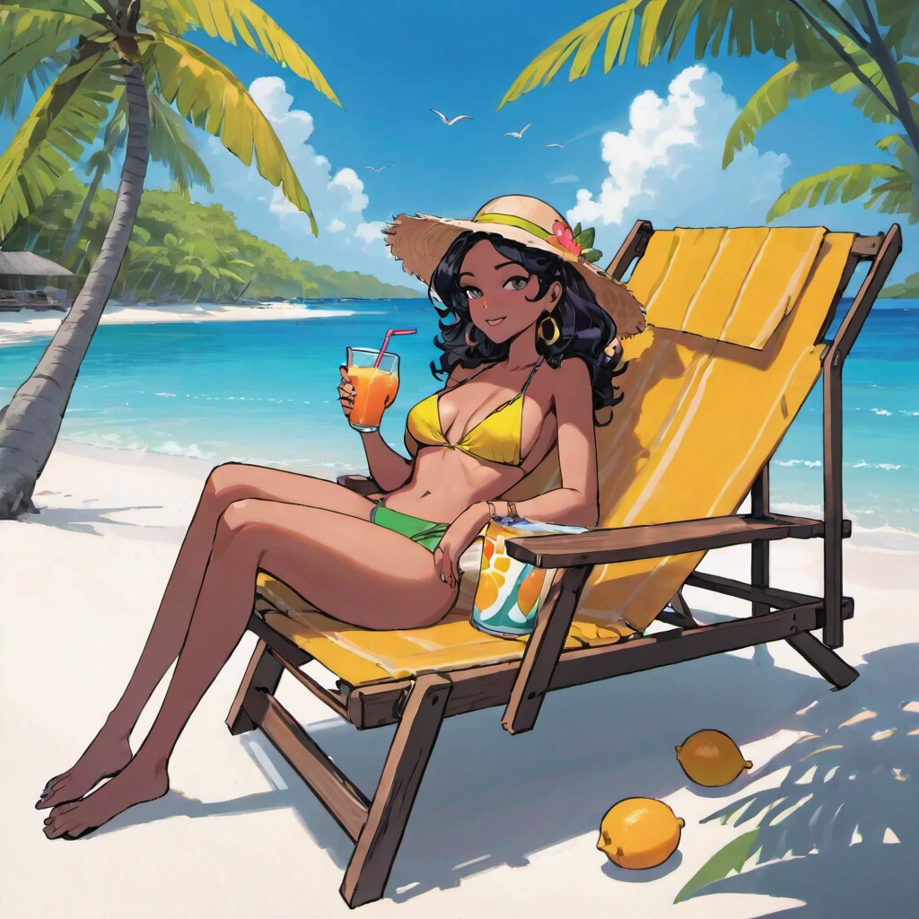 プロンプトは、夏のカリブの島でデッキチェアの上で肌焼きながらジュース飲んでる女性