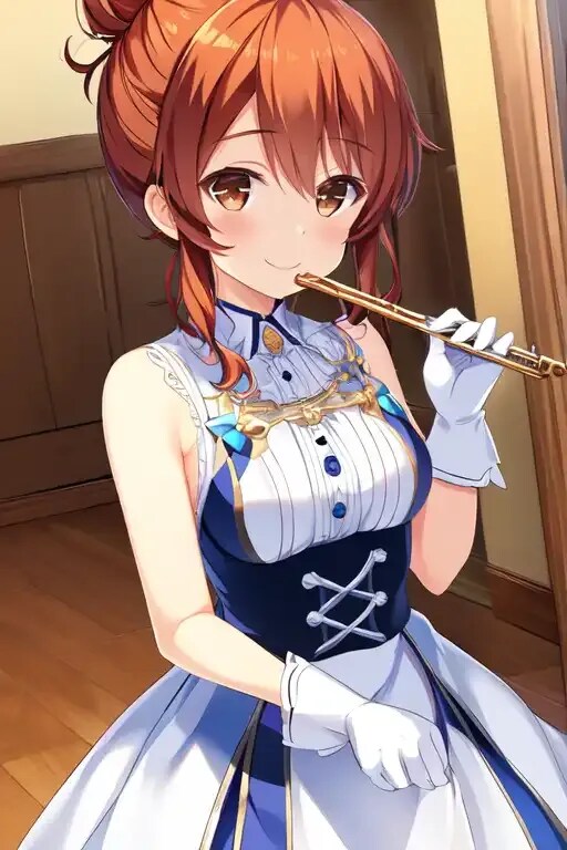 原作のイラストで持ってるフルートは、playing a flute, holding,で出ますが